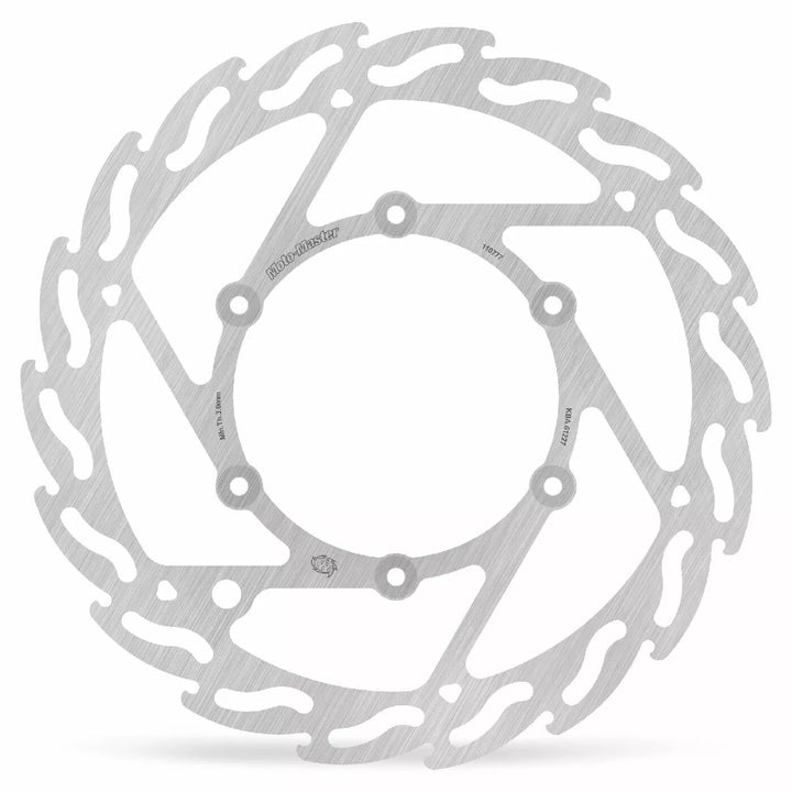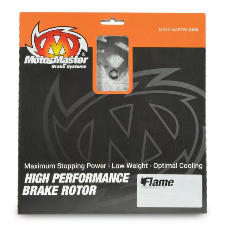 Flame shaped venting slots and outer perimeter ensure an equal amount of contact surface between the brake pad and disc throughout the whole rotation of the disc., Smooth and more predictable braking action which allows you to brake harder., The FLAME Fixed discs are laser cut, CNC drilled, and precision double-grinded for perfect fitment and flatness, For best performance we recommend using Moto-Master Brake Pads with the matching Pad compound that best suits your type of riding.