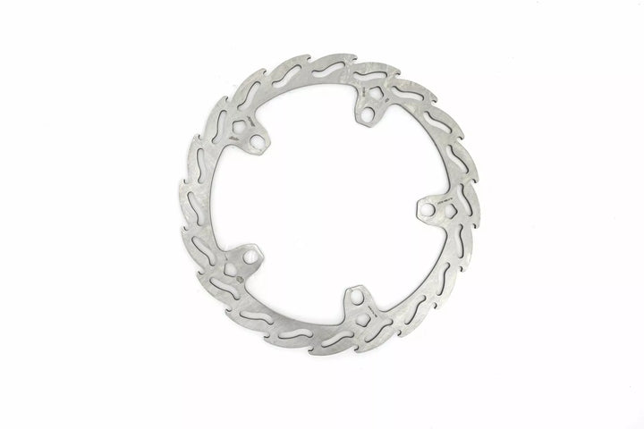 Flame shaped venting slots and outer perimeter ensure an equal amount of contact surface between the brake pad and disc throughout the whole rotation of the disc., Smooth and more predictable braking action which allows you to brake harder., The FLAME Fixed discs are laser cut, CNC drilled, and precision double-grinded for perfect fitment and flatness, For best performance we recommend using Moto-Master Brake Pads with the matching Pad compound that best suits your type of riding.