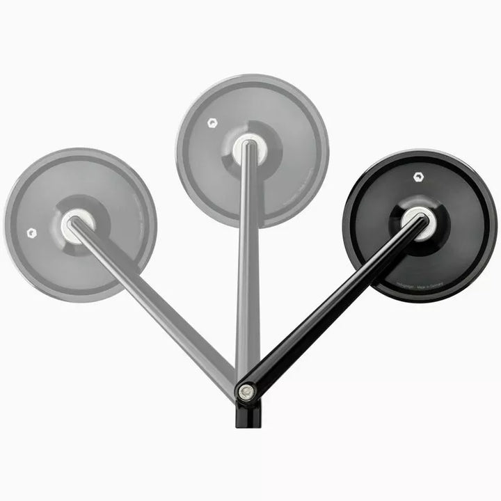 The mirror with swivel mirror arm and defined 45° locking angles is perfect for narrow passages, during transportation or when there are space problems in the garage., Our glassless mirror series mo.view is unique in the world. The special feature of our mirrors is the patented mirror surface, which is worked directly from the metal of the body. The aluminium itself is the mirror surface., The mirror body itself becomes very thin and light, creating a weightless design with no rim or frame. The convex mirror surface is manufactured by fly cutting using diamond tools on ultra-precision machines in Berlin. It is then made resistant to oxidation, corrosion and abrasion by a complex plasma coating in a vacuum., The mirror body and mirror arm are milled from solid aluminium on CNC machines and anodized to a high quality. All screws are made of stainless steel. The precise ball joint allows the mirror to be adjusted comfortably and very stably. Glass breakage or glass falling out is simply not possible., A special feature of the mirrors in the flip series is the pivoting mirror arm with defined locking angles at 45° intervals. This allows the mirror to be tilted upwards as required without changing the mirror setting., Extremely practical for narrow passages, space problems in the garage or for transportation. The locking mechanism is very stable and cannot be adjusted accidentally. The mirror does not vibrate even at high speeds when mounted correctly., The surface-mounted mirror can be fitted to any M10 mirror thread on the handlebars. Three fixing screws with different threads are supplied. The mirror is suitable for the left and right side., Diameter of the mirror body: 99 mm., Thickness of the mirror body without ball head: 4.5 mm., Length of the mirror arm: 150 mm., Weight: approx. 300 g., Scope of delivery: 1x mo.view classic flip surface-mounted mirror (with ECE marking) with arm, 1 x screw M10 x 1.5, 1 x screw M10 x 1.25 right-hand thread, 1 x screw M10 x 1.25 left-hand thread & instructions manual.