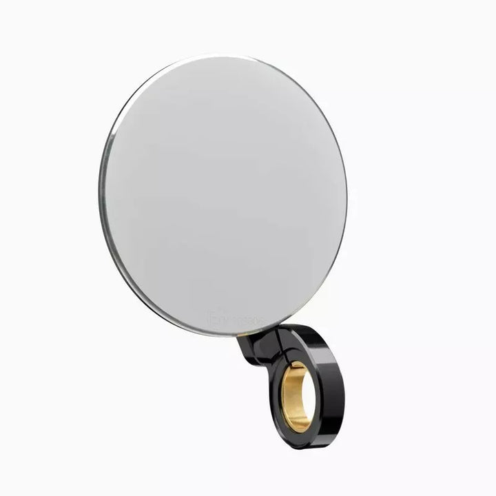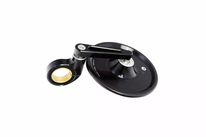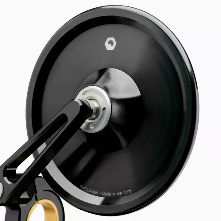 The handlebar end mirror with swivel mirror arm and defined detent angles is perfect for narrow passages or space problems in the garage. The mirror has an ECE marking and can be mounted above or below the handlebar., Our glassless mirror series mo.view is unique worldwide. The special feature of our mirrors is the patented mirror surface, which is made directly from the metal of the body. The aluminium itself is the mirror surface!, The mirror body itself is very thin and light, creating a weightless design without a rim or frame. The convex mirror surface is produced by fly cutting using diamond tools on ultra-precision machines in Berlin. It is then made resistant to oxidation, corrosion and abrasion by an elaborate plasma coating in a vacuum., The mirror body, mirror arm and the clamp for the handlebar end are milled from solid aluminium on CNC machines and anodized to a high quality. All screws are made of stainless steel. The precise ball joint allows the mirror to be adjusted comfortably and very stably. Glass breakage or glass falling out is simply not possible!, A special feature of the flip series mirrors is the pivoting mirror arm with defined locking angles at 45° intervals. This allows the mirror to be tilted upwards as required without changing the mirror setting., Extremely practical for narrow passages, space problems in the garage or for transportation. The locking mechanism is very stable and cannot be adjusted accidentally. The mirror does not vibrate, even at high speeds, if fitted correctly., The mirror can be mounted either above or below the handlebars and is suitable for the right and left side. It is mounted directly on the handlebar end (22 mm and 1 inch) or, if the grips and fittings cannot be moved, using a mo.view bar adapter., Diameter of the mirror body: 99 mm., Thickness of the mirror body without ball head: 4.2 mm., Length of the mirror arm: 72 mm., Clamp diameter: can be used for 22 mm and 1 inch handlebars., Clamp width: 12 mm., Weight: 150 g., Scope of delivery: 1x rear-view mirror mo.view classic 60 flip (with ECE marking) with arm, 1x clamp & instructions manual.