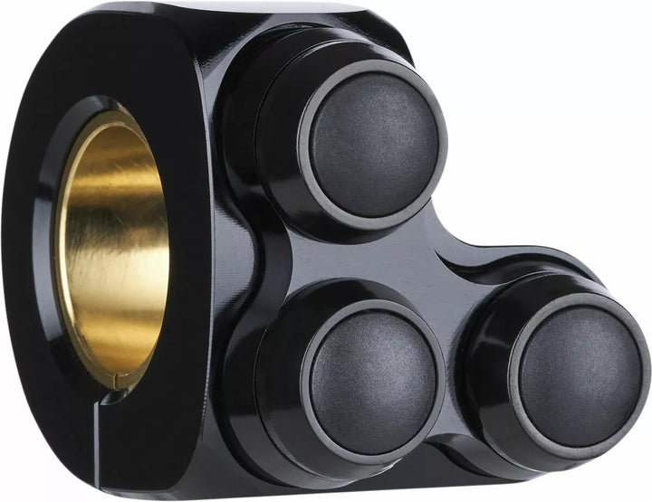 The mo.switch basic is a universal, high-quality push-button control for handlebars with 1 inch or 22 mm (7/8 inch) tube diameter in a simple, elegant design. In combination with an electronic push-button control box (not included), these CNC-made push-buttons can switch all electrical units such as lights, indicators, electric starters, horn and much more., CNC-milled from billet aluminium the housing is anodised in glossy black. Optionally, the button holder (inlay) is also available with a silver anodized color. The compact housing is equipped with either two or three push buttons. All buttons are always in direction to the driver., The two or three buttons per unit are always black. A hidden M4 stainless steel mounting screw clamps the housing securely to each handlebar., The individual buttons are of high quality, very robust and protected against vibrations and splash water (IP65)., Due to sufficient size and ergonomic pressure point (light, mechanical detent), they allow a safe operation - even when operating with a glove., A single-wire or two-wire wiring is easily possible by two terminals per push-button. One terminal for ground is already provided internally for single-wire wiring. Cable routing in the handlebars is therefore easy., In case of possible damage, the single push-buttons are available individually and can be replaced., The mo.switch basic is of course compatible with all common push button controls such as the mo.unit blue/basic.