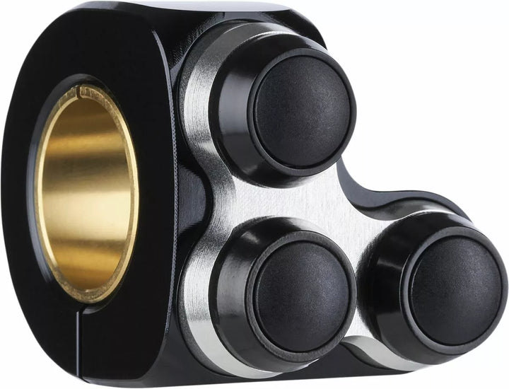 The mo.switch basic is a universal, high-quality push-button control for handlebars with 1 inch or 22 mm (7/8 inch) tube diameter in a simple, elegant design. In combination with an electronic push-button control box (not included), these CNC-made push-buttons can switch all electrical units such as lights, indicators, electric starters, horn and much more., CNC-milled from billet aluminium the housing is anodised in glossy black. Optionally, the button holder (inlay) is also available with a silver anodized color. The compact housing is equipped with either two or three push buttons. All buttons are always in direction to the driver., The two or three buttons per unit are always black. A hidden M4 stainless steel mounting screw clamps the housing securely to each handlebar., The individual buttons are of high quality, very robust and protected against vibrations and splash water (IP65)., Due to sufficient size and ergonomic pressure point (light, mechanical detent), they allow a safe operation - even when operating with a glove., A single-wire or two-wire wiring is easily possible by two terminals per push-button. One terminal for ground is already provided internally for single-wire wiring. Cable routing in the handlebars is therefore easy., In case of possible damage, the single push-buttons are available individually and can be replaced., The mo.switch basic is of course compatible with all common push button controls such as the mo.unit blue/basic.