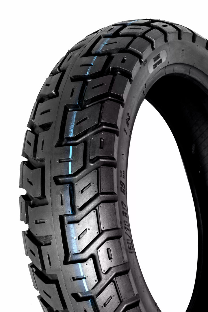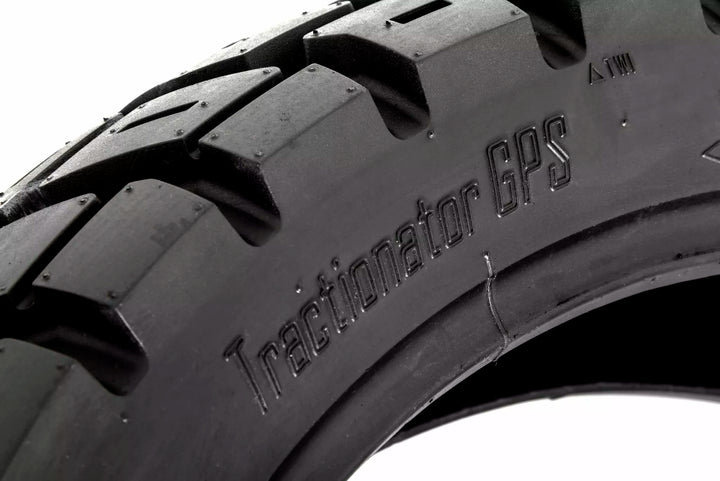 Reversible rear to suit the rider’s needs – either 50/50 or Mostly Off-Road., In 50/50 direction the GPS is a well behaved street-able tyre with smooth cornering transition from centre to cranked all the way over., Mostly Off-Road direction the aggressive straight line hook-up and cornering drive is engaged for better off-road traction., Long mileage, serious traction and smooth transition from pavement to gravel to dirt, the GPS does it all., Deeper tread than most adventure tyres., Stronger carcass construction than other 50/50 adventure tyres provides world class performance with a high resistance to punctures, Unique Hybrid compound with Silica for long mileage and optimum grip in mud and snow.
