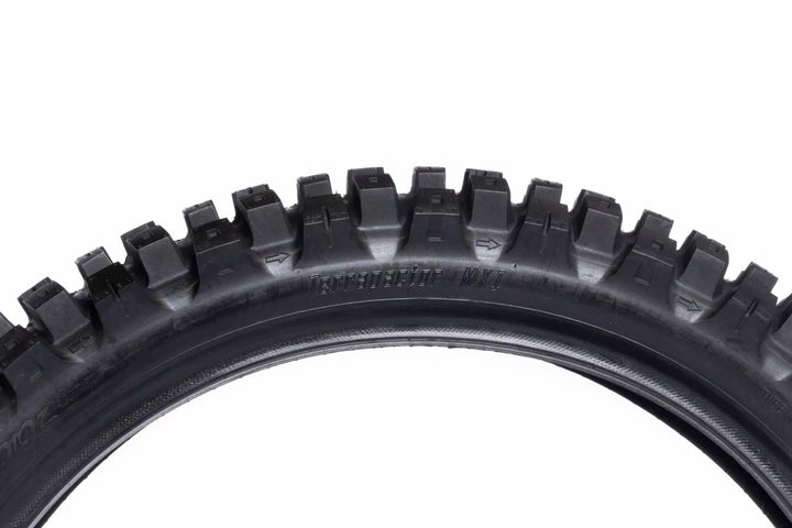 The latest addition to the Motoz MX tyre range is the Terrapactor MXI (MX intermediate) competition tyre. Engineered with a lightweight carcass and designed to excel in intermediate to hard terrain (mix of loose and packed soil, hard packed soil and deep heavy ruts). The benchmark for MX tyre performance across multiple types of terrain!, The MXI tyre stands out with its distinctive pattern, specifically crafted to deliver top performance. By strategically incorporating flex points within the carcass and knobs, the MXI tyre provides predictability and enhanced corner grip, adapting and flexing according to the terrain to give greater control and confidence while riding., Application: MX Intermediate to hard terrain (mix of loose and packed soil, hard packed soil and deep heavy ruts), Full range from Mini-Cross to Big bikes (15 different sizes), Two front tyre sizes, 80/100-21 for the most aggressive on track performance and the all-new 90/100-21 with a taller profile for increased contact patch and better feel and feedback under race conditions, Unique flex zones built into carcass and knobs for improved feel and compliance, Flex zones incorporated into all tread rows to improve corning feel and drive, All new inner sidewall construction for improved compliance in corners and in a straight line