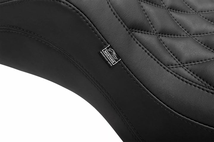 Double diamond stitch pattern with colored thread options offer a new take on a classic favorite, Crafted for rider comfort, the seat features a specially designed recessed cross section that alleviates tailbone pressure, offering both comfort and style in one sleek package, Wide driver bucket seat positions the rider slightly back for optimal comfort while providing exceptional lower back support with its high-rising wall, Wide squared-off tail section provides a stable foundation for passengers or luggage, ensuring a smooth and enjoyable ride for the 2-up rider, Positions riders slightly further back compared to stock with significantly enhanced lower back support, Performance-packed cover features split-panel, contrasting stitch, perforated look, and functional gripper vinyl, Carefully curated tail section allows for comfortable 2-up riding, Mustang's proprietary controlled-density foam formula requires no break-in and retains shape and support after years of use, Marine-grade fiberglass baseplate for long lasting support and durability, with polyurethane bumpers to absorb vibration