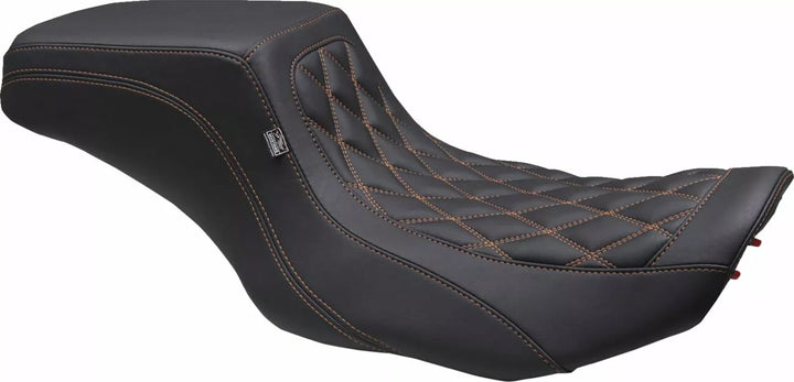 Double diamond stitch pattern with colored thread options offer a new take on a classic favorite, Crafted for rider comfort, the seat features a specially designed recessed cross section that alleviates tailbone pressure, offering both comfort and style in one sleek package, Wide driver bucket seat positions the rider slightly back for optimal comfort while providing exceptional lower back support with its high-rising wall, Wide squared-off tail section provides a stable foundation for passengers or luggage, ensuring a smooth and enjoyable ride for the 2-up rider, Positions riders slightly further back compared to stock with significantly enhanced lower back support, Performance-packed cover features split-panel, contrasting stitch, perforated look, and functional gripper vinyl, Carefully curated tail section allows for comfortable 2-up riding, Mustang's proprietary controlled-density foam formula requires no break-in and retains shape and support after years of use, Marine-grade fiberglass baseplate for long lasting support and durability, with polyurethane bumpers to absorb vibration