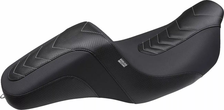 Performance-packed variation of one of the most popular seat platforms with a unique look, Featuring contrasting-color, reverse apex chevron pattern on perforated vinyl, Split-panel, gripper vinyl cover for stabillity and performance, Riders are positioned slightly further back compared to stock, High-rising wall allows the rider increased lower back support, Wide tail section provides a stylish look and ample comfort for 2-up riding, Mustang's proprietary controlled-desnsity foam formula requires no break-in and retains shape and support after years of use, Marine-grade fiberglass baseplate for long lasting support and durability, Polyurethane bumpers to absorb vibration