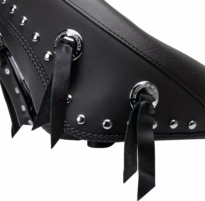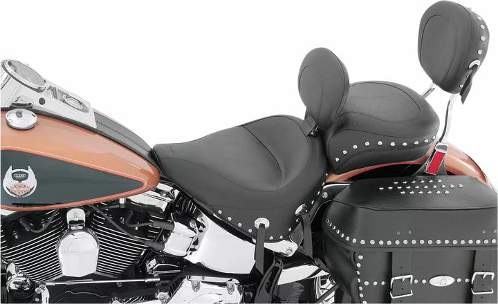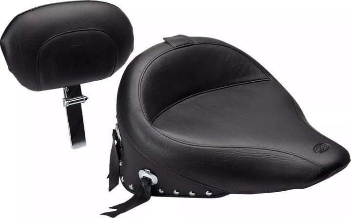 Solo seat is trimmed with a functional skirt that comes down over the frame and fender for a clean, uninterrupted look, Backrest has four height adjustments from 13.5" to 15.5" above seat bucket, and measures 7" high by 12" wide, Matching rear seat features a recess in the front of pad to accommodate the backrest (sold separately), Backrest is easily removed and installed without tools; folds forward for easy mounting of bike, Steel base with support wings holds up the full width of the foam bucket, Made in the U.S.A.