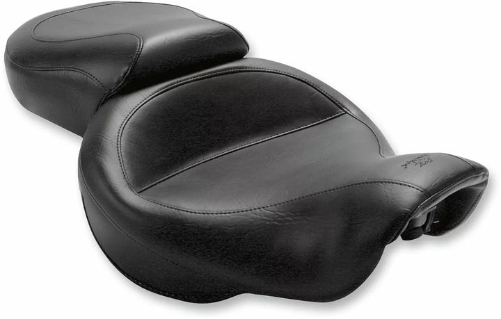 Front bucket is trimmed with a functional skirt that comes down over the frame and fender for a clean, uninterrupted look, Vintage cover is made from highest quality expanded vinyl, Passenger seat angles forward to support the rider's back, Built on a single-piece steel base that fits like stock, Made in the U.S.A.