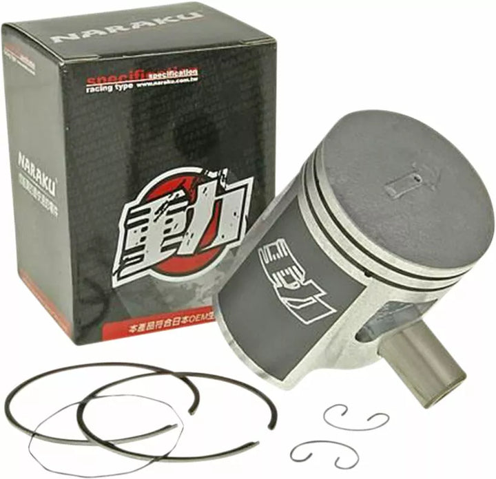 NARAKU performance quality piston set, The NARAKU piston has a molybdenum coating to reduce wear and shorten the running-in period, The CNC-machined grooves in the piston skirt ensure continual lubrication, Piston kit comes complete with rings, oil scraper rings, gudgeon pin and circlips