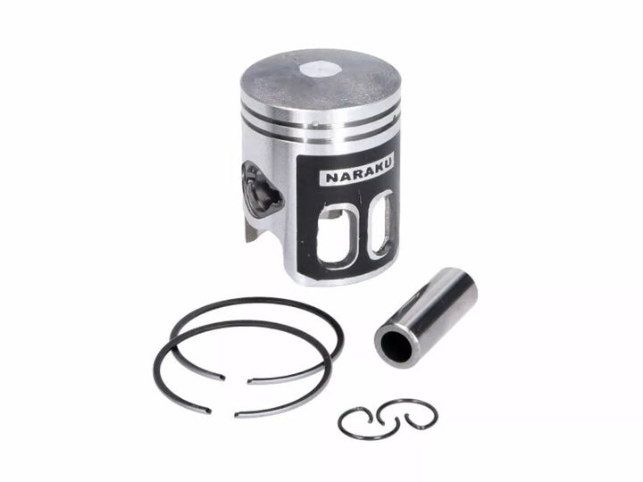 NARAKU performance quality piston set, The NARAKU piston has a molybdenum coating to reduce wear and shorten the running-in period, The CNC-machined grooves in the piston skirt ensure continual lubrication, Piston kit comes complete with rings, oil scraper rings, gudgeon pin and circlips