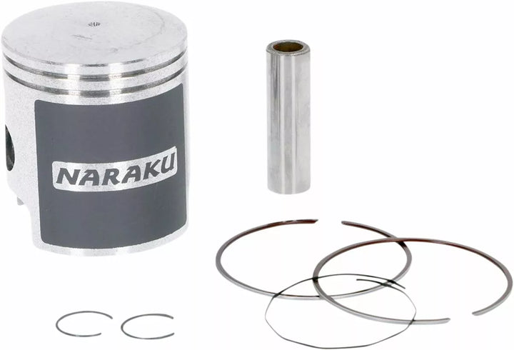 NARAKU performance quality piston set, The NARAKU piston has a molybdenum coating to reduce wear and shorten the running-in period, The CNC-machined grooves in the piston skirt ensure continual lubrication, Piston kit comes complete with rings, oil scraper rings, gudgeon pin and circlips