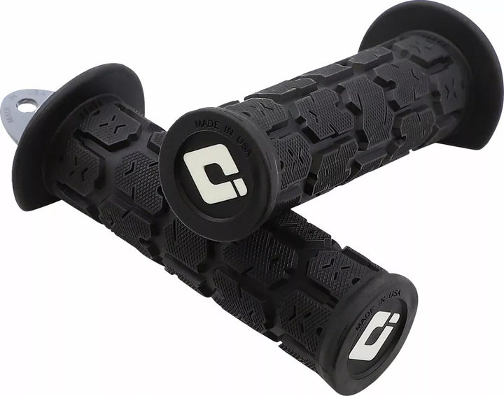 Chunky, oversized grip provides extra shock absorption and improved control , Larger grip diameter delivers extra padding, rugged surface pattern for better traction, Extra-large raised pads provide shock absorption with deep grooves to channel away dirt and debris, Molded inner 1st pass for easy, knock-out-ends for full-wrap handguards, Preinstalled ODI V2.1 Lock-Jaw Clamps with screws , Patented Lock-On Grip System™ design delivers easy installation and ensures 100% slip free performance