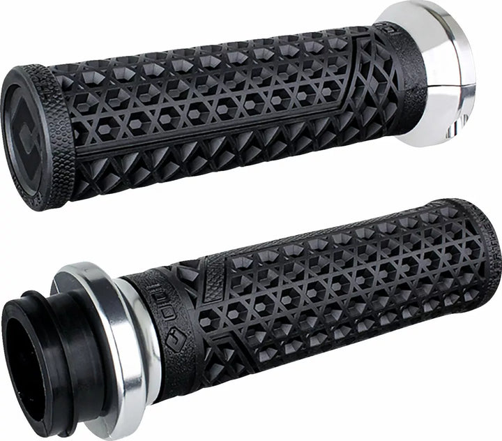 The Vans V-Twin Lock-On Grip System feature the classic Vansᆴ waffle sole pattern and are built to deliver an amazing riding experience, 100% slip-free performance guaranteed, In-molded throttle tube with integrated application specific throttle actuation, Billet aluminum Lock-Onル style clutch side clamp eliminates the need for grip glue or safety set-screws, providing simple installation and removal, T15 Torx bolts provide extra secure clamping for solid, twist-free mounting, Proprietary medium-compound durometer improves overall comfort and durability, 130 mm overall grip length with flange, Made in the U.S.A.