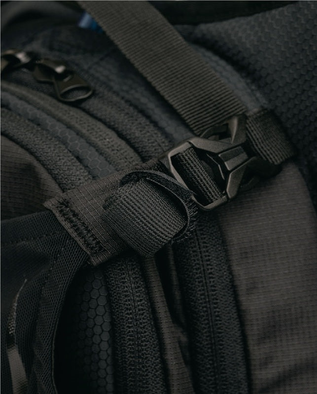Dedicated Anti-Sloshing hydration bladder compartment with hook & loop secure strap for holding bladder in place and tube channel port