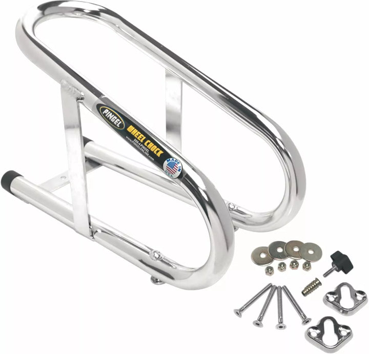 Mounting brackets remain fastened while the chocks are easily removed by unscrewing the T-bolt hold-down screw, Stabilize the front wheel of a motorcycle for trailer transportation, Wheel chocks can easily be removed when not in use, Made in the USA, Additional mounting kits sold separately, enabling you to move the chock from one surface to another without removing the mounting brackets.