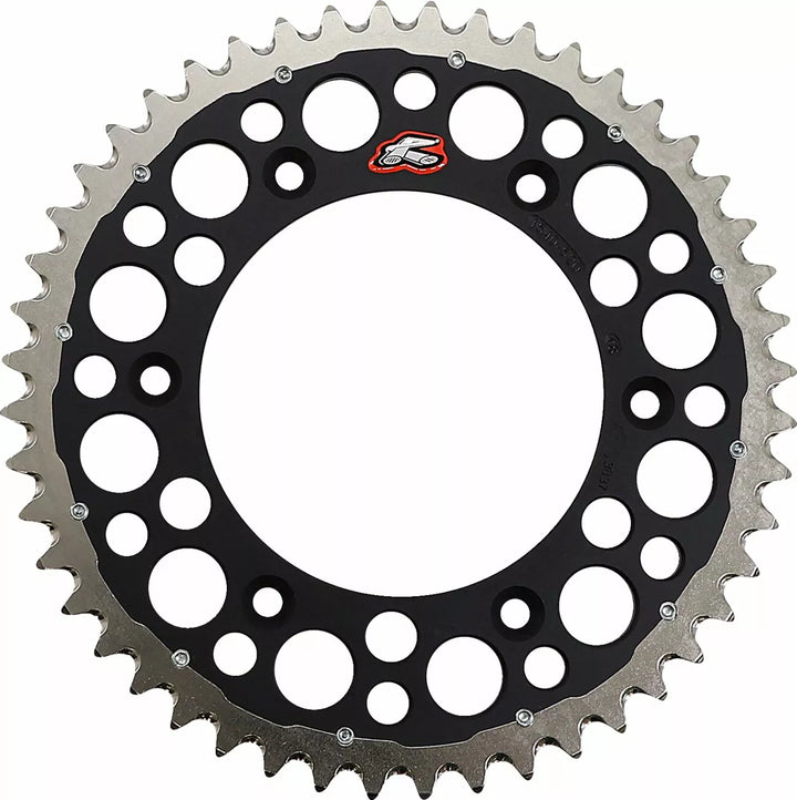 Inner ring is the same high strength Ultralightル 7075 T-6 aluminum used for the standard Renthal sprocket, Outer ring is electro-less nickel coated steel for ultimate durability and is designed with the minimum amount of material to keep weight down, The outer ring is expanded at 200ᄚC and then fitted over the inner; this interference fit combined with the wave pattern ensures a permanent bond for the life of the chainwheel, The flat socket head screws add additional strength to the chainwheel during side impacts and eliminates contact with the chain guide, Self cleaning mud grooves between each tooth prevent dirt build upand reduce chainwheel wear and weight, Will outlast a standard all aluminum sprocket by 3 times, yet is much lighter than an all steel rear sprocket