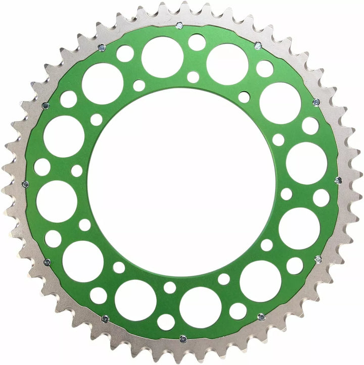 Inner ring is the same high strength Ultralightル 7075 T-6 aluminum used for the standard Renthal sprocket, Outer ring is electro-less nickel coated steel for ultimate durability and is designed with the minimum amount of material to keep weight down, The outer ring is expanded at 200ᄚC and then fitted over the inner; this interference fit combined with the wave pattern ensures a permanent bond for the life of the chainwheel, The flat socket head screws add additional strength to the chainwheel during side impacts and eliminates contact with the chain guide, Self cleaning mud grooves between each tooth prevent dirt build upand reduce chainwheel wear and weight, Will outlast a standard all aluminum sprocket by 3 times, yet is much lighter than an all steel rear sprocket