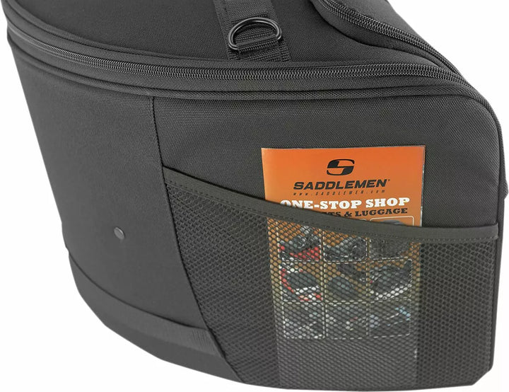 Designed to fit perfectly between the rider and the tour pack, Constructed of UV-, water and weather resistant 1200D textile, Multiple oversized mounting rings around the bag overcome unique mounting challenges, Three external pockets provide extra storage organization, Integrated MOLLE attachment mounting option, Strong, nylon meshing zipper teeth with black sliders equipped with large pulls for easy use with a gloved hand, Reflective rain cover with locking cinch cord included, Holds shape even when empty