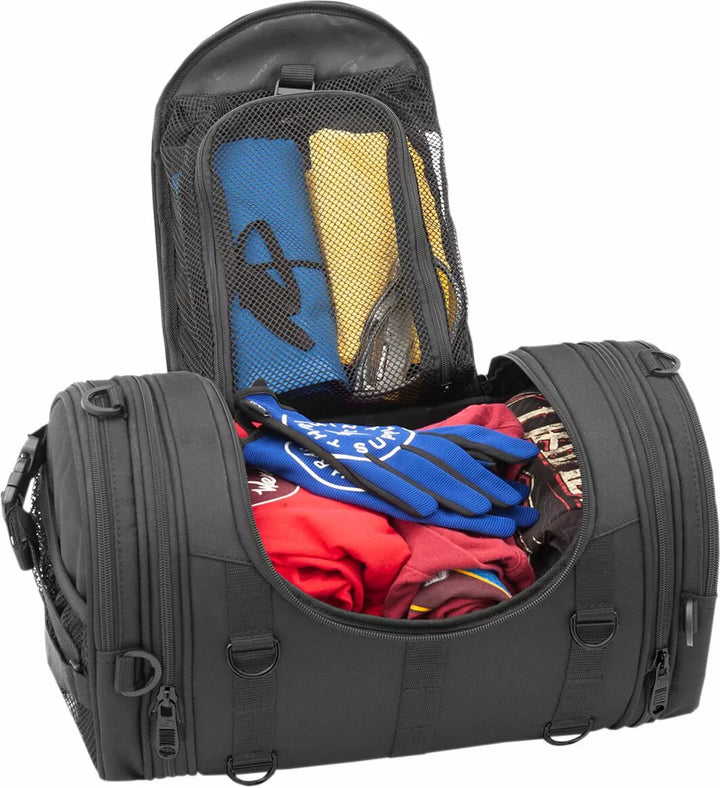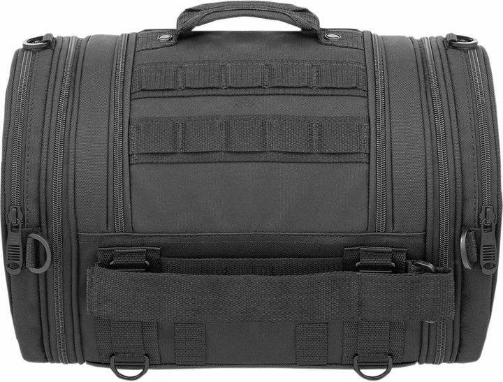 Dimensions: 16" wide x 10" deep x 10" tall (with an additional 3” expansion), Cubic Inches: 1,300, UV-rated, weather-resistant 1200d chassis, Maintains shape even when empty, Wide zippered center opening assures ease of loading, End pockets expand out providing additional packing room when needed, Internal zippered mesh pockets keep items organized, Easy-mounted to sissy bar plus full mounting strap kit for a variety of mounting options, All strap end include our unique keepers system which eliminates the need for cutting after the bag is installed, Multiple heavy-duty D-Rings for additional mounting or attaching options, Integrated MOLLE modular attachment points for storage customization, Includes removable shoulder strap and carrying handle for transportation ease, EU dimensions 40,64 cm width x 25,4 cm depth x 25,4 cm height with an addition of 7,62 with expansion., EU capacity 21,30 L