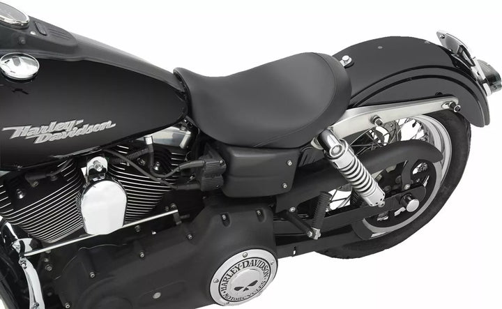 The progressive density foam with a top layer of SaddleGelル offers a surprising amount of supportive comfort for a slammed solo seat, The sculpting of the seat not only creates a smart style, but it gives riders a short leg reach to the ground for confident stops, Gel-coated, marine grade fiberglass pans and chrome brackets make sure the seat is durable for decades of riding, Offer excellent comfort with a classic feel and are weather-resistant for low-maintenance ownership, Easy to install, just like the bike's original seat; includes additional mounting hardware as needed, Really low to create a stylish saddle so thin it barely covers the bike's battery, The perfect seat choice for the rider alone, no passenger pillion, Designed and made in the U.S.A.