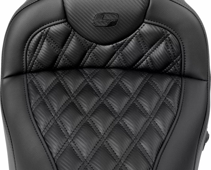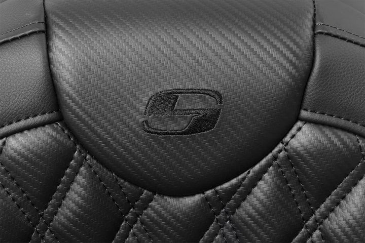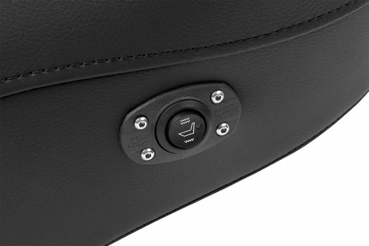SaddleGelル in front and rear reduces tailbone pressure and increases circulation and comfort for both driver and passenger, Tall lumbar support and wide driver saddle supports the back and legs for superior comfort, while the streamlined nose improves the rider's reach to the ground, Refined split-cushion design separates the seating surface from the lumbar support, reducing tailbone and back pressure from maximum long-range comfort, Ventilated soft upholstery seating leather provides the most luxurious look and ride, No rain cover included; rain cover is optional, 5-1/2" (13.97 cm) lumbar support, Designed and made in the USA