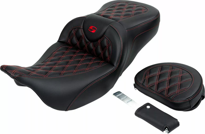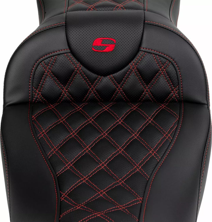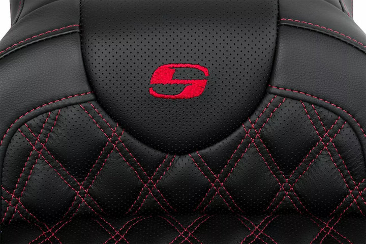 SaddleGelル in front and rear reduces tailbone pressure and increases circulation and comfort for both driver and passenger, Tall lumbar support and wide driver saddle supports the back and legs for superior comfort, while the streamlined nose improves the rider's reach to the ground, Refined split-cushion design maximizes long-range comfort by separating the seating surface from the lumbar support to reduce tailbone and back pressure, Ventilated soft leather upholstery provides a luxurious look and ride, Comes with a fitted rain cover specially designed to protect your seat from water and dirt, Made with perforated leather inserts and weatherproof, no-maintenance-required SaddleHydeル, Designed and made in the USA