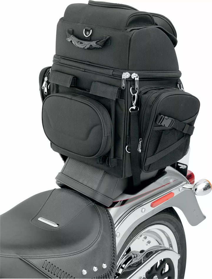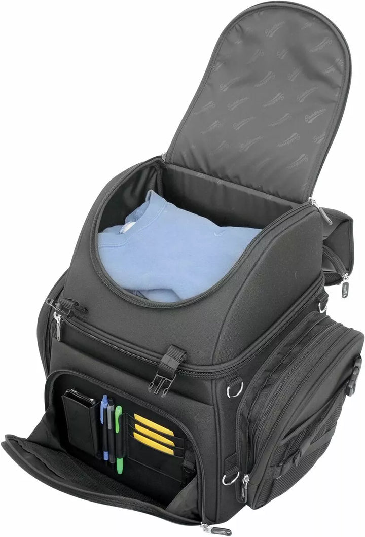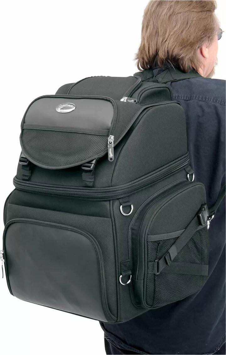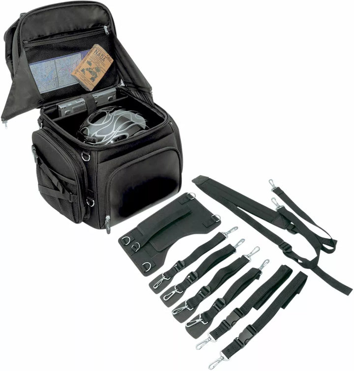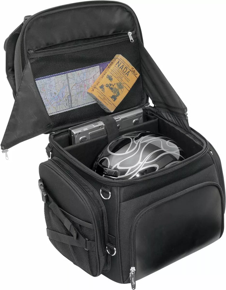 Two mounting systems included: Saddlemen's "Versa-Mount" under-seat yoke and harness, and an adjustable sissy bar strap system that easily attaches bag to your motorcycle's seat, luggage rack or sissy bar, Backrest pad can be adjusted for additional comfort for the passenger or driver, Include detachable backpack straps for easy off-the-bike jaunts, Include another large top-loading main compartment with internal organizer pocket, Five external pockets, two of which can be expanded for added capacity, Five internal and two outer mesh pockets, Rain cover with security tether protects the bag from the elements, Top exterior flap can be adjusted to carry a jacket, Mini-padlock, with extra keys, helps secure your belongings in the bag, Internal structure maintains bag shape and is strong enough to lean on, even when empty, BR3400 measures 14" W x 19" H x 12" D; 3,400 cubic inches (55.72 L) cargo capacity; holds one full-face helmet plus other cargo, No sissy bar required, EU: BR3400 measures 35,56 cm W x 48,26 cm H x 30,48 cm D; 55,72 L cargo capacity; holds one full-face helmet plus other cargo