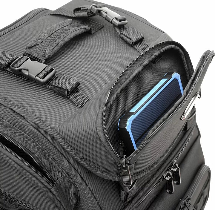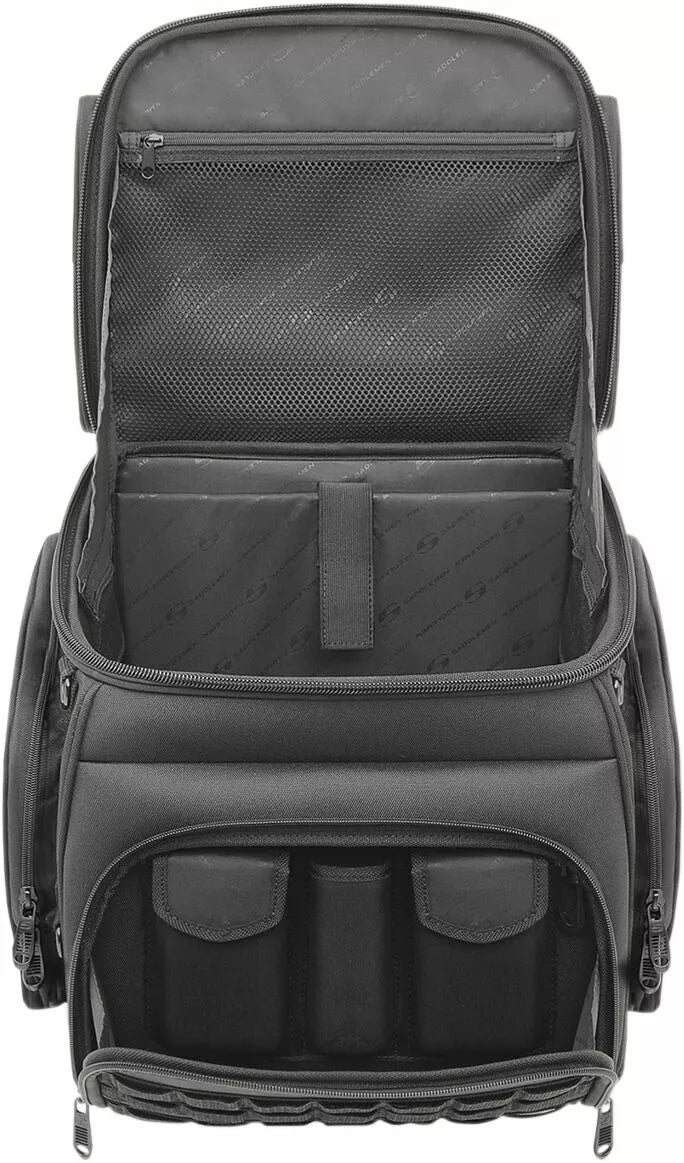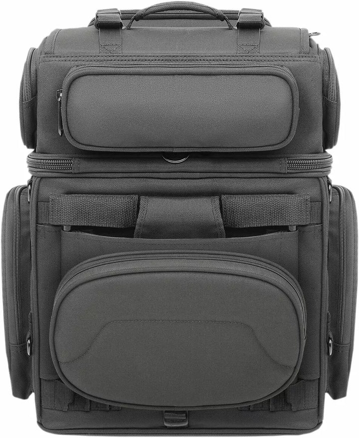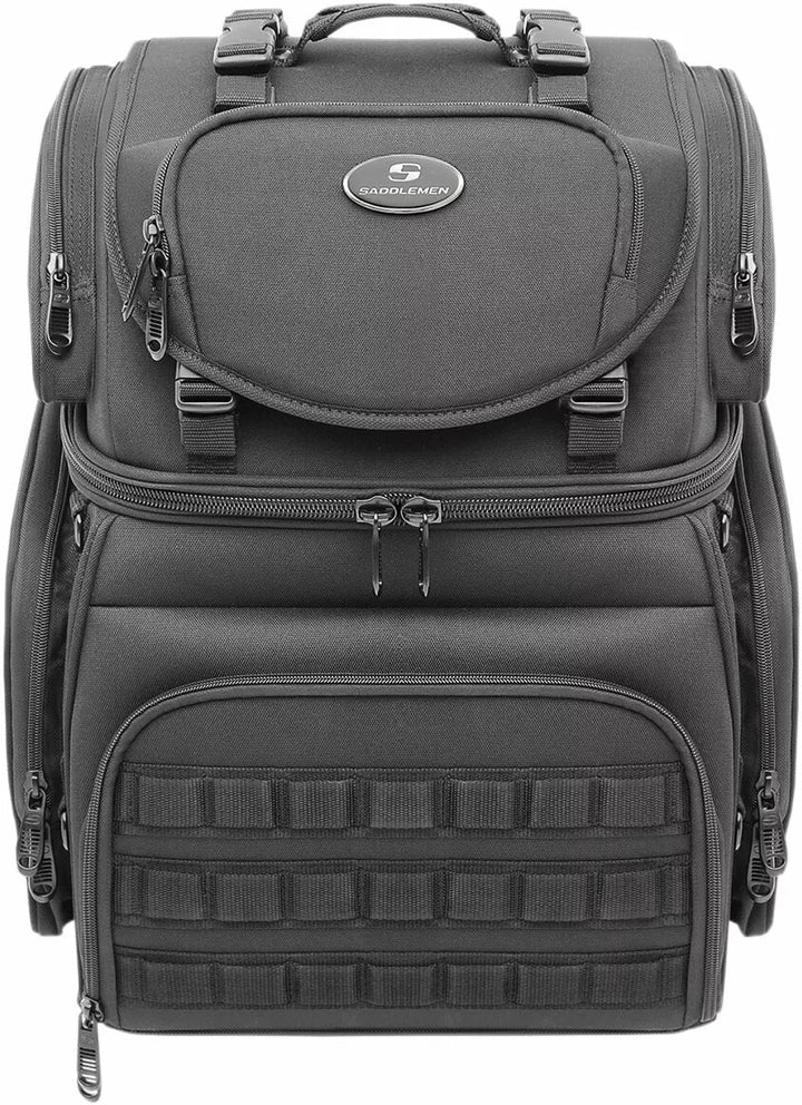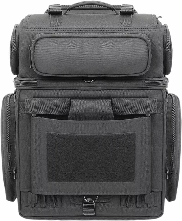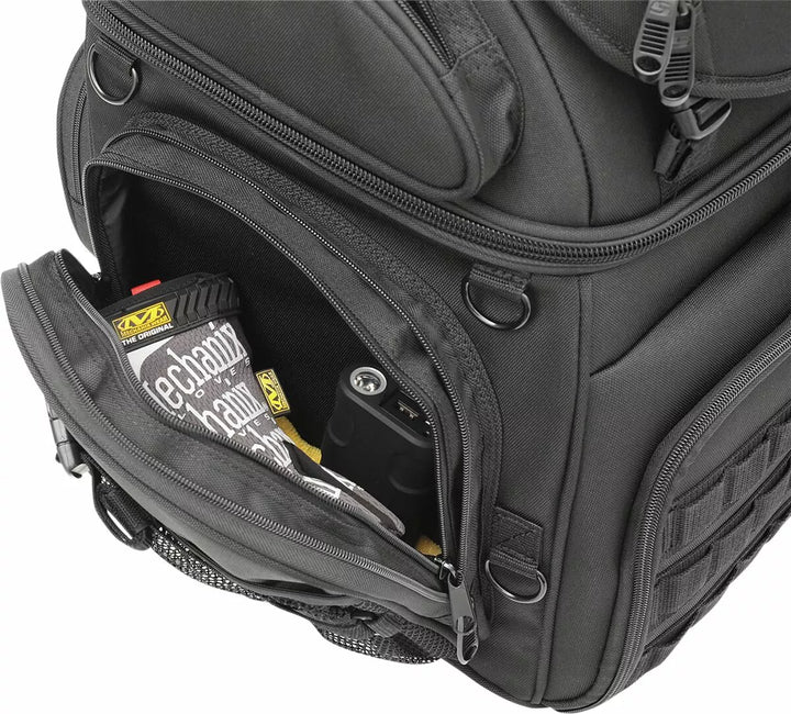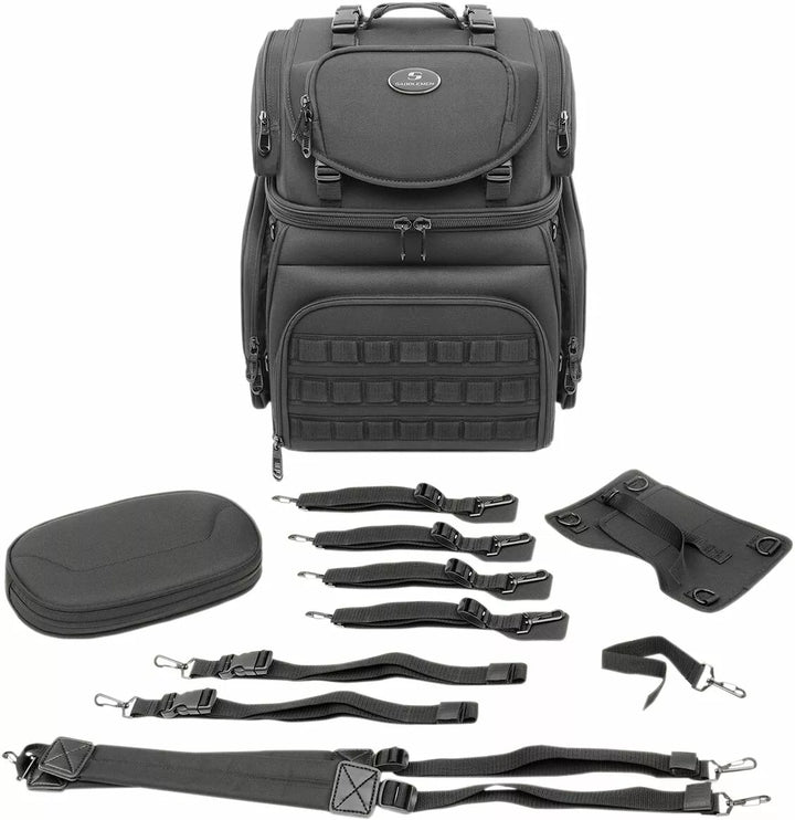 All strap ends include unique keepers system which eliminates the need for cutting after the bag is installed, Easy-mounted to sissy bar plus full mounting strap kit for a variety of mounting options, Multiple heavy-duty D-Rings for additional mounting or attaching options, Integrated MOLLE modular attachment points for storage customization, Includes tethered rain cover for added protection from the elements, Wide zippered center opening assures ease of loading, Internal zippered mesh pockets keep items organized, UV-rated, weather-resistant 1200d chassis, Maintains shape even when empty, Six large external pockets