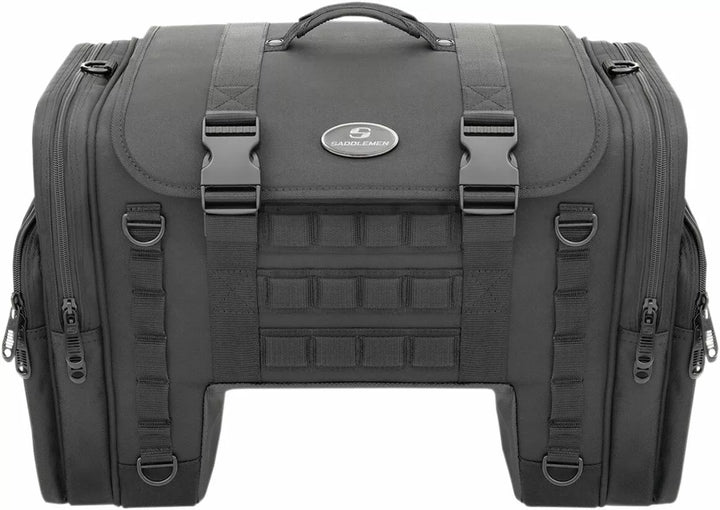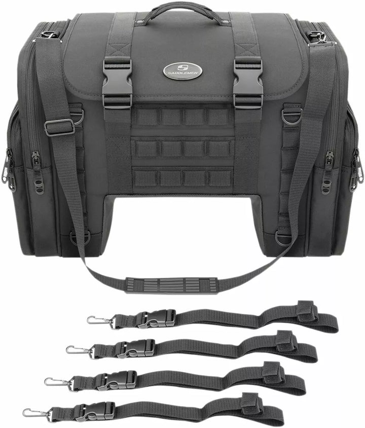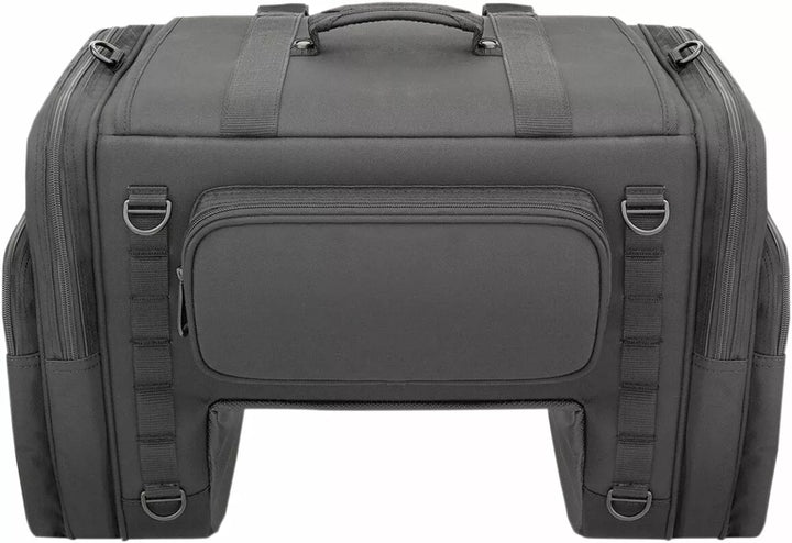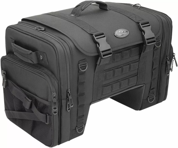 Strong, nylon meshing zipper teeth with black sliders equipped with large pulls for easy use with a gloved hand, Oversized mounting rings around the bag help overcome unique mounting challenges, Tech organizer is perfect for smartphones, digital cameras or MP3 players, Designed to fit perfectly between the rider and the tour pack, Constructed of UV-, water- and weather-resistant 1200D, Reflective rain cover with locking cinch cord included, Integrated MOLLE attachment mounting option, Dimensions: 25” W x 13.5” H x 11” D, Holds shape even when empty, Multiple external pockets