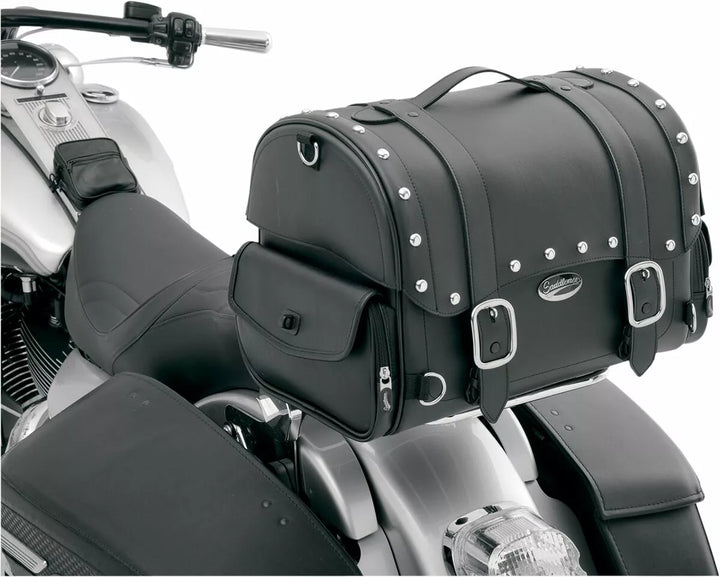 Sleek-styled tail bag featuring straps, studs and large chromed buckles, Lockable, quick-release buckles hidden below large chrome buckles, Made of rugged leather-grain, weather-resistant SaddleHyde™ and plastic reinforcing panels, Rigid construction keeps these bags looking good, full or empty, Designed for multiple mounting options adaptable to any bike; attaches to sissy bar, rack or atop passenger seat, Easy-to-use sissy bar strap included; multiple anchor points, including four heavy-duty chromed D-rings and several strap slots provided for fast, easy mounting, Riveted top handle and removable shoulder strap for convenient transport off the bike, Hat-box style lid with long sides for protection against weather, grime and other elements, Easy-open lid provides convenient access, Two zippered and flap-covered side pockets provide extra storage, Hanging internal mesh pocket provides separate storage inside bag and helps organize contents, Measures 16" L x 10¼" W x 12½" H: 19" L with pockets