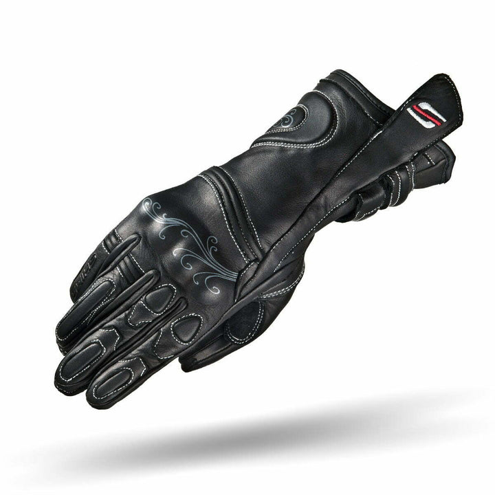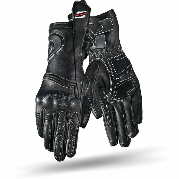 Modellen är specialdesignad utifrån den anatomiska strukturen hos en kvinnas hand, det vill säga längre och smala fingrar och en smalare mellanhand och handled. Två justeringsremmar fästa med kardborreband och en lång elastisk manschett gör att du kan anpassa handsken efter din hand. Handskarna är gjorda av högkvalitativt naturligt anilinläder. Shima Moderna-modellen fick även delikata feminina mönster på handryggen.