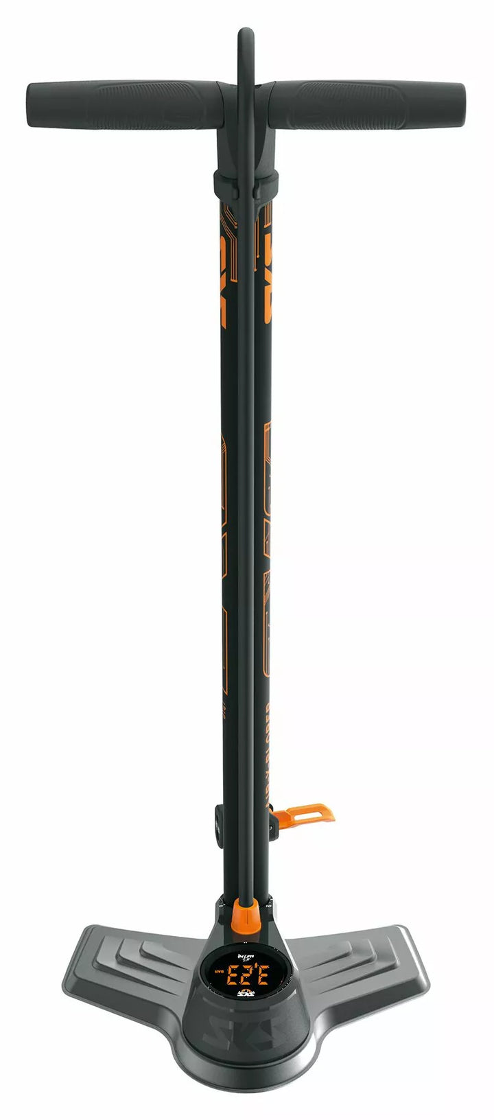 The SKS AIR-X-PLORER DIGI 10.0 floor pump impresses with a high-quality LED digital pressure gauge. , The first-class sensor technology guarantees high measuring accuracy and delivers precise air pressure values up to 10 bar (144 PSI)., Other features include the soft-touch handle with handle compartment für tyre levers, the extra long high-pressure hose and the “MV EASY” multi valve head for all valve types., The large steel tube and the solid metal base guarantee good power transfer, ensuring that higher pressures (476 cm³ stroke) can be easily pumped into the tyres., Incl. battery: 2 x Micro AAA., Made in Germany.