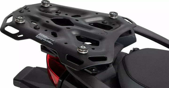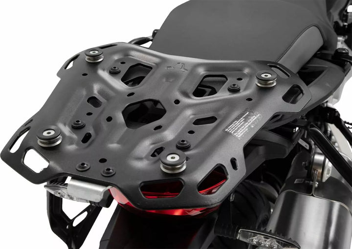 Extremely robust rack for long tours and off-road rides, Exclusive manufacturing processes and its optimized shape lend an extra dose of stability to the rack, Its extreme durability during vibrations, impacts and high weight was tested in the lab and off-road under harshest conditions, Multiple functional bores: for TRAX top cases. SysBag with adapter plate are available separately with the appropriate adapter kit, Offers adapter kits for attaching top cases from Givi, Krauser and Shad, Easy rigging of luggage on numerous, large lashing eyes, threading of 25 mm fasteners possible, Especially large contact surface (Width: 32.9 cm at the front, 22.5 cm at the back, Length: 30.3 cm), Easy installation on original attachment points with bike-specific attachment elements