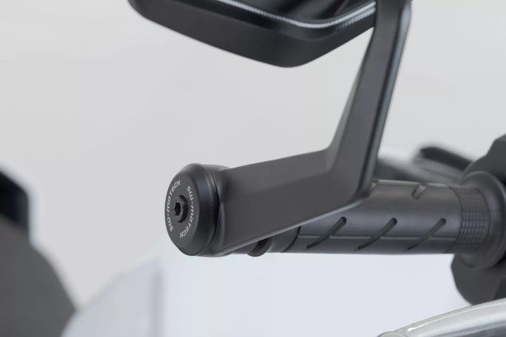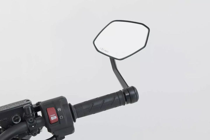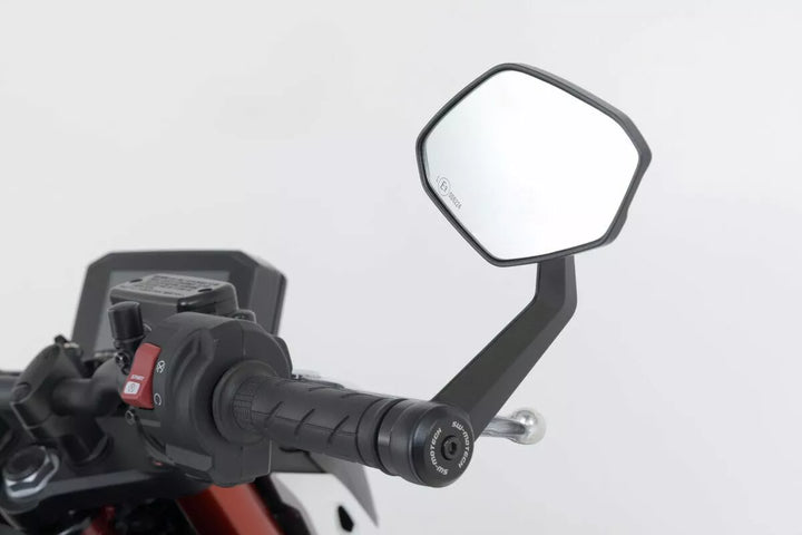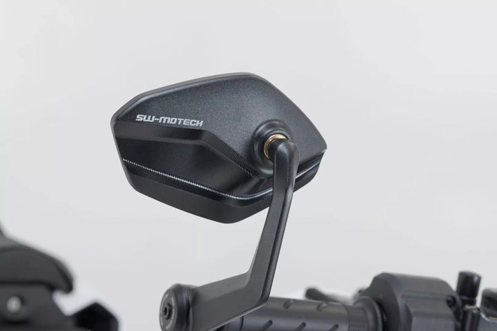 The mirrors are made from forged, milled and black anodized aluminium and feature engraved logo details. Thus, they add a robust yet elegant touch to your handlebars., The aerodynamically designed wrap-around arm and the timeless, simple design of the mirrors blend perfectly on either modern naked sport bikes or modern retro-styled scramblers or caf� racers., The ball head behind the mirror housing enables precision and versatile adjustment of your field of view so that you always have a clear view of what is happening behind you. Together with the mounting parts included in the sets, they can be fitted to your motorcycle with a perfect fit and ensure a high-quality and harmonious appearance thanks to carefully selected and coordinated surfaces., The ultimate in visibility: swap standard for premium and enjoy the attention your motorcycle will attract in the parking lot with these exclusive mirrors and always keep a safe eye on your passengers on the road., Made from high-quality forged and black anodized aluminium., Modern edge design with re-milled sections., Ball head behind the mirror housing with large adjustment range ensures precise alignment of the field of vision., Mirror arm length: 157 mm., All components required for mounting on your motorcycle are included in delivery, including attachment of the brake fluid reservoir if required., Cover caps for the threads of the original mirrors included in delivery., Scope of delivery: 1 x Mirror Set Sport, 1 x mounting instructions and mounting material.