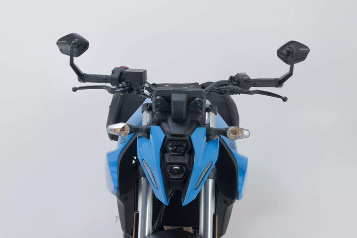 The mirrors are made from forged, milled and black anodized aluminium and feature engraved logo details. Thus, they add a robust yet elegant touch to your handlebars., The aerodynamically designed wrap-around arm and the timeless, simple design of the mirrors blend perfectly on either modern naked sport bikes or modern retro-styled scramblers or caf� racers., The ball head behind the mirror housing enables precision and versatile adjustment of your field of view so that you always have a clear view of what is happening behind you. Together with the mounting parts included in the sets, they can be fitted to your motorcycle with a perfect fit and ensure a high-quality and harmonious appearance thanks to carefully selected and coordinated surfaces., The ultimate in visibility: swap standard for premium and enjoy the attention your motorcycle will attract in the parking lot with these exclusive mirrors and always keep a safe eye on your passengers on the road., Made from high-quality forged and black anodized aluminium., Modern edge design with re-milled sections., Ball head behind the mirror housing with large adjustment range ensures precise alignment of the field of vision., Mirror arm length: 157 mm., All components required for mounting on your motorcycle are included in delivery, including attachment of the brake fluid reservoir if required., Cover caps for the threads of the original mirrors included in delivery., Scope of delivery: 1 x Mirror Set Sport, 1 x mounting instructions and mounting material.