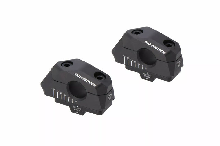 The bar riser made of high-quality aluminum alloy moves the handlebars up by 25 mm and, depending on the setting, in 5 mm increments closer to the rider, The bar riser ensures noticeably more comfort when driving, because you can bring the handlebars closer to your own height for a more comfortable and upright sitting position, You have the choice between seven different positions, in 5 millimeter increments, The stable and weather-resistant bar riser fits on handlebars with a diameter of 22 mm, Made from high-strength aluminum alloy, CNC-etched, With engraved logo and SW-MOTECH lettering, For a more relaxed sitting position, Corrosion protection thanks to anodized finish, Adjust the position of the handlebars to one of 6 positions, at 5 millimeter increments, Increase of 25 millimeters, For handlebars with a diameter of 22 mm