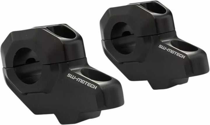 For � 22 mm handlebars with a bore spacing of 32-38 mm, Displacement of the handlebar 30 mm upwards and 21 mm backwards, Black powder coating protects against corrosion, Made of high-strength aluminium alloy, Included in delivery, 2 x Bar back, 2 x Handlebar clamps, Mounting instructions, Mounting material, Details