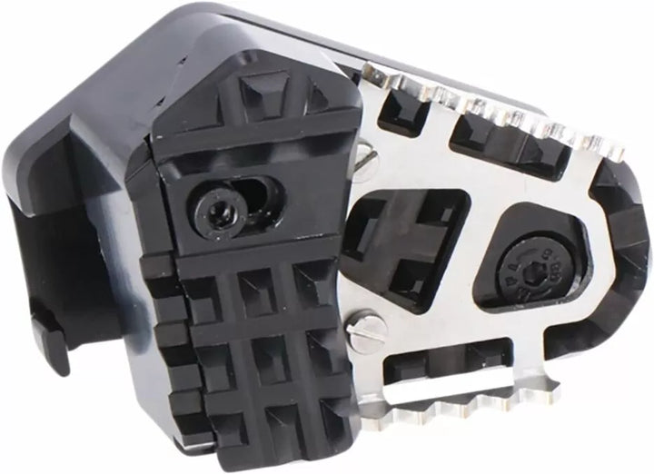 The extension for brake pedal is ideal for off-roading: it enhances the original brake arm tread and guarantees a safe, controlled use of the brake. , When standing, the angle of your knee changes, so your foot cannot put as much pressure on the smaller pedal. , The extension makes it possible for the contact surface to be both broader and higher., Thanks to the raised contact surface, your foot is angled more sharply, so it can reach and control the brake arm more easily, even when standing. , That means the extension for brake pedal offers better safety and better control over the rear brake., When off-roading, you often alternate between seated and standing positions. , In addition to the raised surface, the extension for brake pedal features a widened contact surface. , This is equipped with a ridged surface, so it offers improved grip when the arm surface is dirty or wet., Enhances the original brake pedal, Raised and wider surface, Improved grip thanks to ridged surface ヨ even when wet and dirty, Raised contact surface by 22 or 27 millimeters
