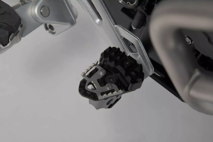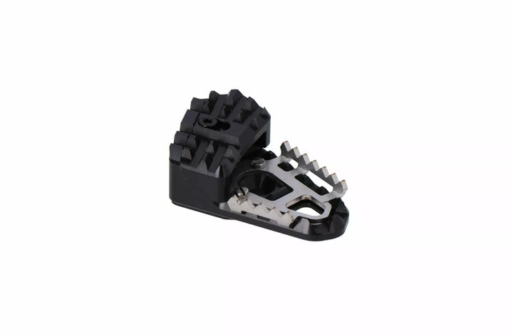 The extension for brake pedal is ideal for off-roading: it enhances the original brake arm tread and guarantees a safe, controlled use of the brake. , When standing, the angle of your knee changes, so your foot cannot put as much pressure on the smaller pedal. , The extension makes it possible for the contact surface to be both broader and higher., Thanks to the raised contact surface, your foot is angled more sharply, so it can reach and control the brake arm more easily, even when standing. , That means the extension for brake pedal offers better safety and better control over the rear brake., When off-roading, you often alternate between seated and standing positions. , In addition to the raised surface, the extension for brake pedal features a widened contact surface. , This is equipped with a ridged surface, so it offers improved grip when the arm surface is dirty or wet., Enhances the original brake pedal, Raised and wider surface, Improved grip thanks to ridged surface ヨ even when wet and dirty, Raised contact surface by 22 or 27 millimeters