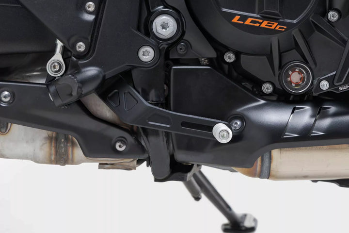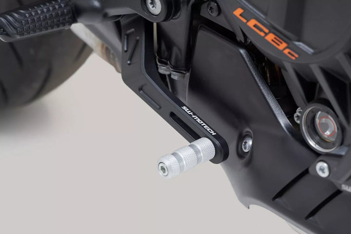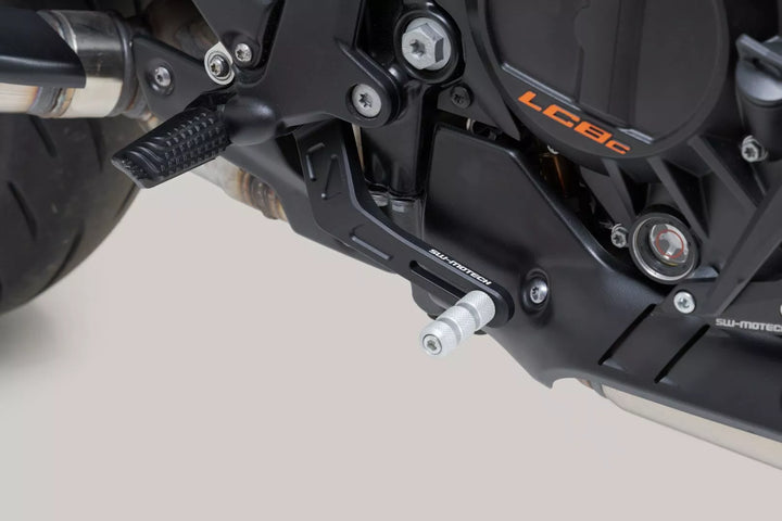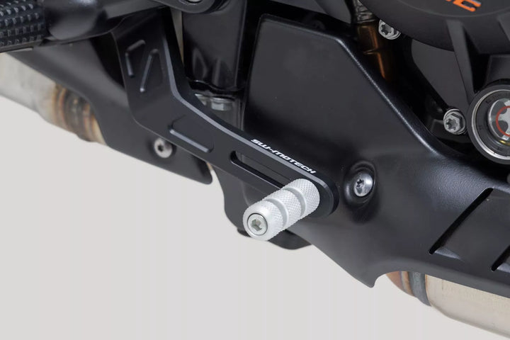 Bike-specific aluminum lever arm, Robust construction, perfect fit: CNC-milled, HART-COATᆴ coated aluminum, High-quality milled tread for maximum stability, Tread STREET included by default in delivery., Better ergonomics and safe operation of the brake pedal, Knurling increases grip and prevents slipping., Platform features various adjustable positions, Adventure tread for off-road touring (sold separately), 1 x Brake pedal, Mounting instructions, Mounting material
