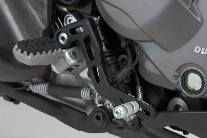 Bike-specific aluminum lever arm, Robust construction, perfect fit: CNC-milled, HART-COATᆴ coated aluminum, High-quality milled tread for maximum stability, Tread STREET included by default in delivery., Better ergonomics and safe operation of the brake pedal, Knurling increases grip and prevents slipping., Platform features various adjustable positions, Adventure tread for off-road touring (sold separately), 1 x Brake pedal, Mounting instructions, Mounting material