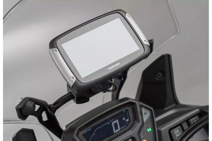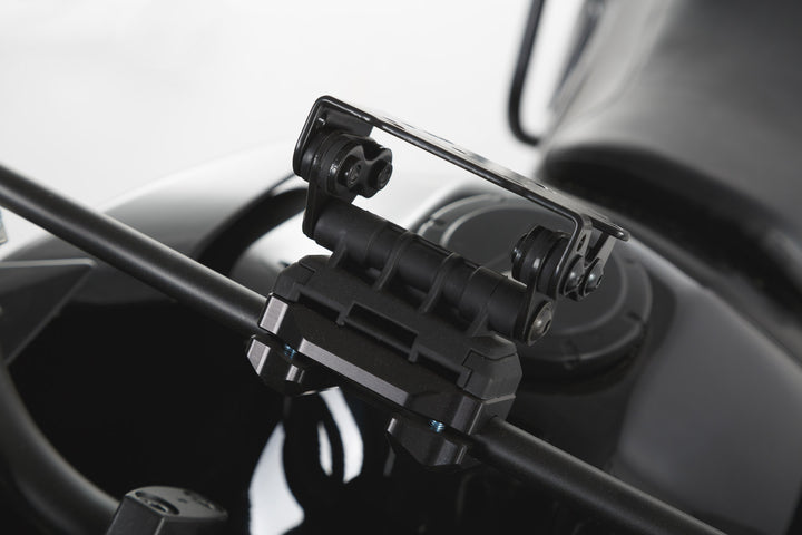 Crossbars, windshield mounts or other bars in the cockpit can provide the ideal connection point for mounting your GPS device, depending on your bike model, Removable, shock-absorbent GPS device holder, Pivotable for ideal view of devices, Retaining plate with universal drill-hole pattern provides secure hold for the usual GPS models and Navi Case Pro device cases or hardcases from SW-MOTECH, Included in delivery, 1 x GPS mount, Mounting instructions, Mounting material