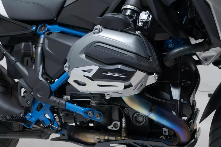 These specially designed guards fit seamlessly into the design of the BMW and protect the boxer cover against damage from rocks and falls, Set includes two protectors for both boxer covers, CNC-milled, anodized aluminum slider pads, With integrated rubber damping, Simple mounting onto original frames, Included in delivery, 2 x Cylinder guard, right and left side, Mounting instructions, Mounting material