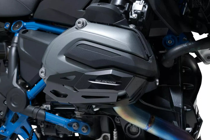 These specially designed guards fit seamlessly into the design of the BMW and protect the boxer cover against damage from rocks and falls, Set includes two protectors for both boxer covers, CNC-milled, anodized aluminum slider pads, With integrated rubber damping, Simple mounting onto original frames, Included in delivery, 2 x Cylinder guard, right and left side, Mounting instructions, Mounting material