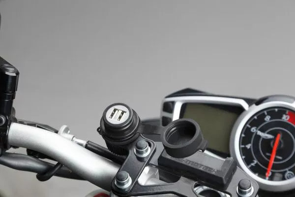 With this dual USB charging socket you can operate and charge GPS devices, digital cameras, smartphones and tablets, The high-quality dual USB socket and the completely insulated cable harness are protected from water spray by rubber seals, USB double charging socket, Power output 2,000 mA / 5 V, For 12 V Car operating voltage, Sealed cable harness, Included in delivery, 1 x Double USB socket, 1 x Cable harness, Mounting instructions, An additional mounting plate is required for installation (Item No. EMA.00.107.12300)