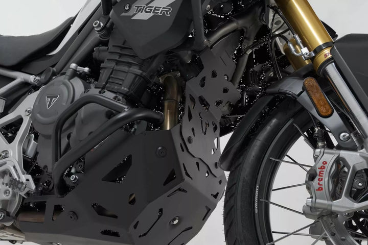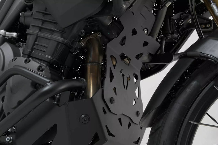 The engine guard extension protects the front area of the engine block from rock chips, Made from brushed and power-coated aluminium, the extension can be mounted on its own or in addition to an SW-MOTECH engine guard, 3-piece protection made of 3 mm thick aluminum, Extends the engine guard in front of the engine block by up to 130 mm, Included in delivery, Mounting material, Mounting instructions