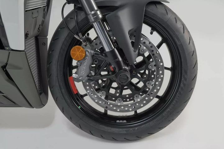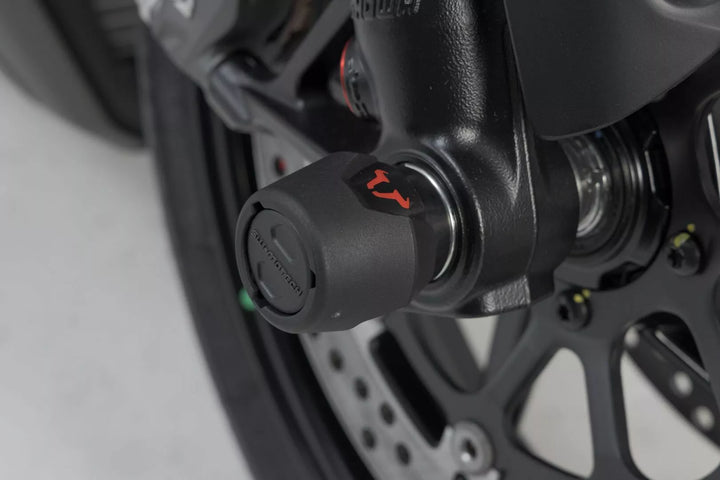 These crash pads made of abrasion-resistant plastic provide additional safety for the drive shaft: the 50-millimeter diameter creates a large contact surface for the best possible force distribution, With their shapely design, the pads fully match the look of the motorcycle, Drive shaft protection, Discreet slider pad made from abrasion-resistant polyamide, Optimized surface with good gliding properties, Easy mounting onto the front axle, Included in delivery, 2 x Slider set for front axle, Mounting instructions, Mounting material