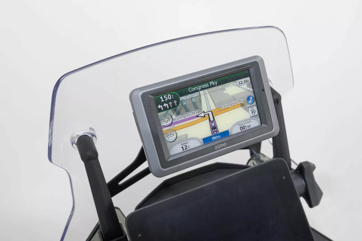 The holder was developed to fit this motorcycle model, The RAM clamping arm with two ball joints enables individual positioning of devices, The universal mount can be used to mount GPS devices or splash-proof bags, Included in Delivery, 1 x Mounting bracket, 1 x Ball adapter M8, 1 x Ball joint with mounting plate, 1 x RAM socket arm, Mounting instructions, Mounting material