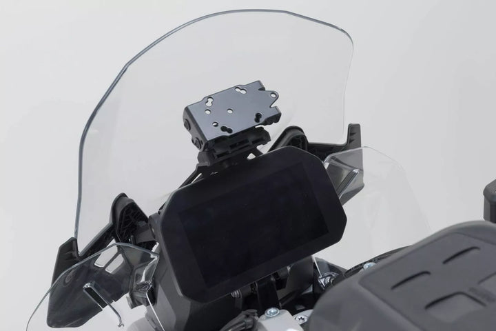In order to achieve optimal positioning, a powder-coated steel plate ensures the stable attachment of the GPS mount on original attachment points in the cockpit, Clever positioning, vibration dampening and easily removable: The bike-specific GPS mount combines all of these features, Easy mounting on available attachment points in the cockpit, GPS mount made of black, powder-coated steel with QUICK-LOCK mechanism made of glass fiber reinforced plastic, Made to fit each bike model for optimal positioning, Removable, pivotable and shock-absorbent, Retaining plate with universal drill-hole pattern provides secure hold for the usual GPS models and Navi Case Pro device cases or hardcases from SW-MOTECH, Included in delivery, 1 x GPS mount for cockpit, Mounting instructions, Mounting material